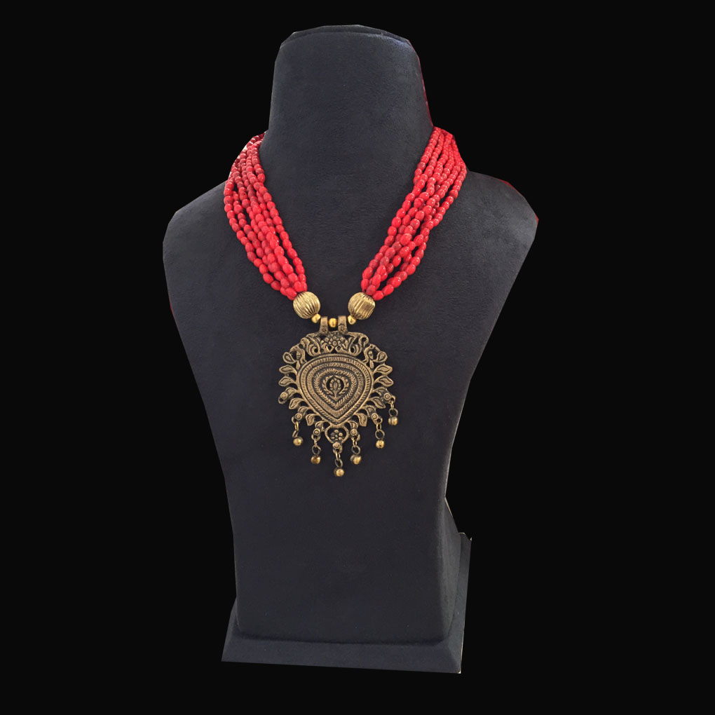 Handmade Vintage Red Coral Beats With Beautiful Bronze Pandel